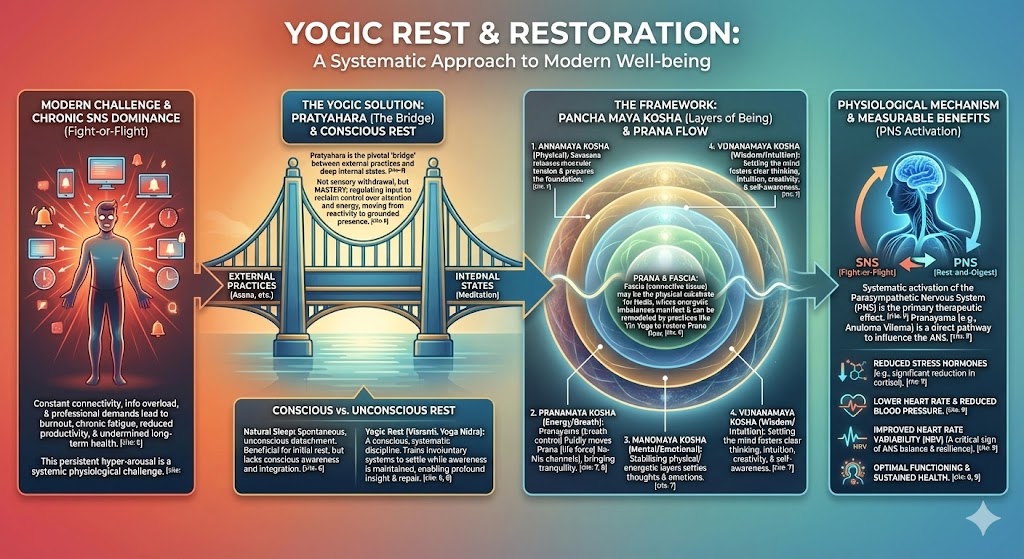 The primary therapeutic effect of yogic deep relaxation, whether through Savasana or Yoga Nidra, is the systematic activation of the Parasympathetic Nervous System (PNS)—the “rest-and-digest” mechanism—and the resulting deactivation of the Sympathetic Nervous System (SNS)—the “fight-or-flight” response.