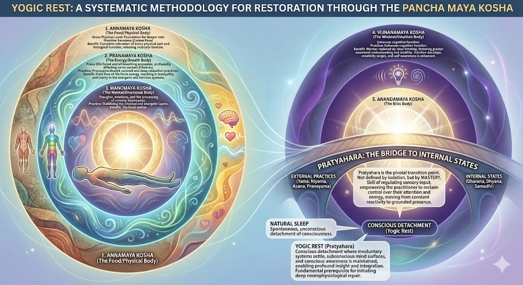 This report aims to provide an exhaustive, evidence-based analysis linking the classical yogic framework for restoration—encapsulated by practices such as Pratyahara, the Koshas, and Yoga Nidra—to quantifiable, modern mechanisms of repair, including Autonomic Nervous System (ANS) regulation, neuroplasticity, and inflammation reduction. Furthermore, the analysis provides strategic, high-impact implementation methods suitable for integration into the life of the time-constrained, busy individual seeking sustained resilience and optimal functioning.
