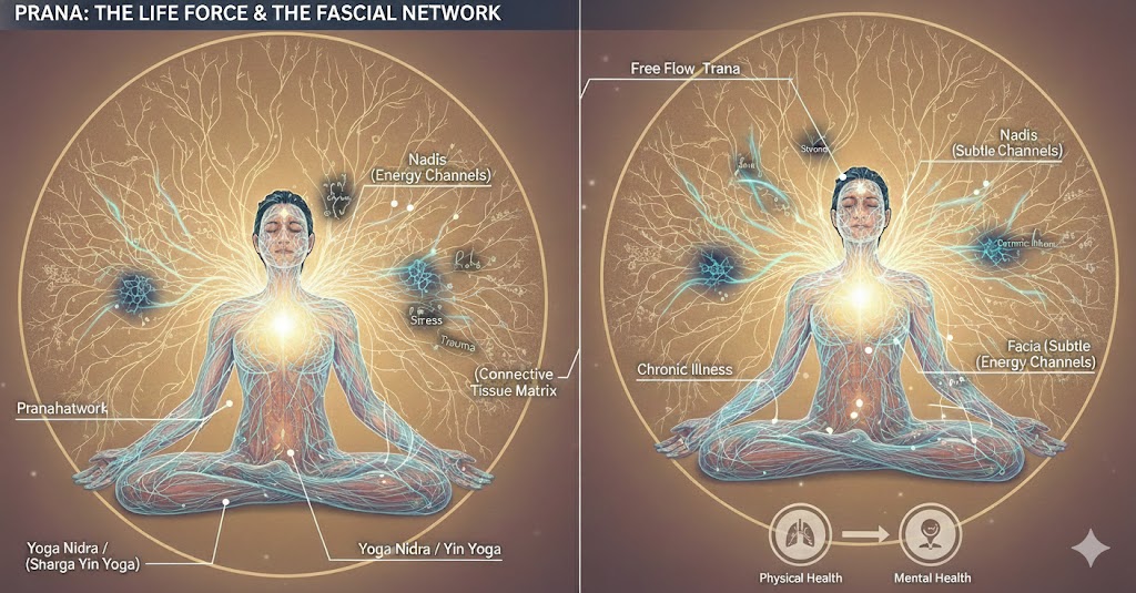 The connection between this ancient energetic model and modern physiology lies in the body’s connective tissue. Recent biomedical research strongly suggests that the dense network of fascia within the body may serve as the physical substrate for the subtle energy channels described as meridians in Traditional Chinese Medicine (TCM) and, by extension, the Nadis in yoga. Fascia is the medium through which energetic imbalances manifest and through which they can be corrected. Because connective tissues are drier structures requiring time and specialized care, practices that target them, such as Yin Yoga, are effective means of remodeling this tissue, releasing deeply held tension in the body and mind, and restoring the smooth flow of Prana.